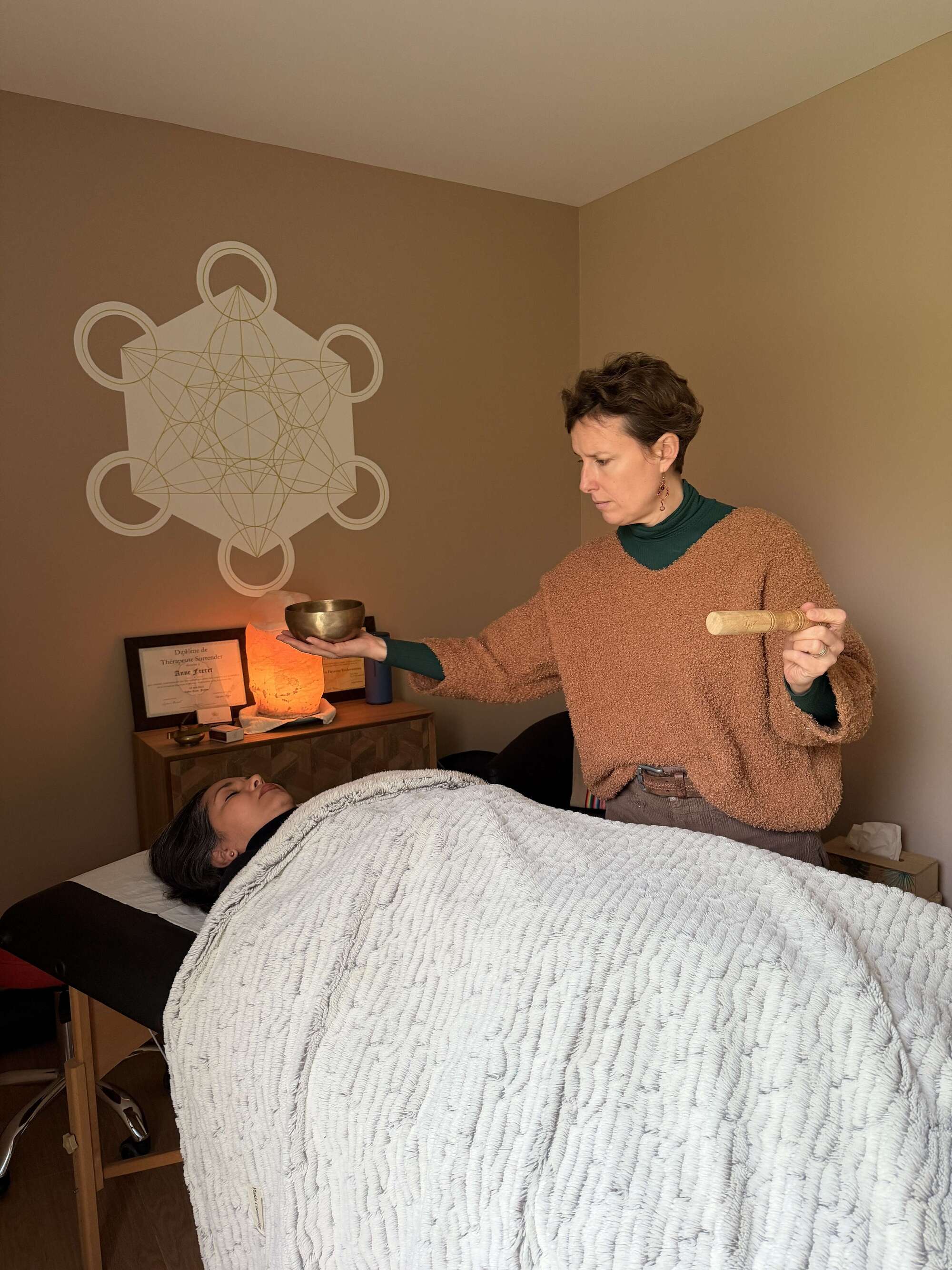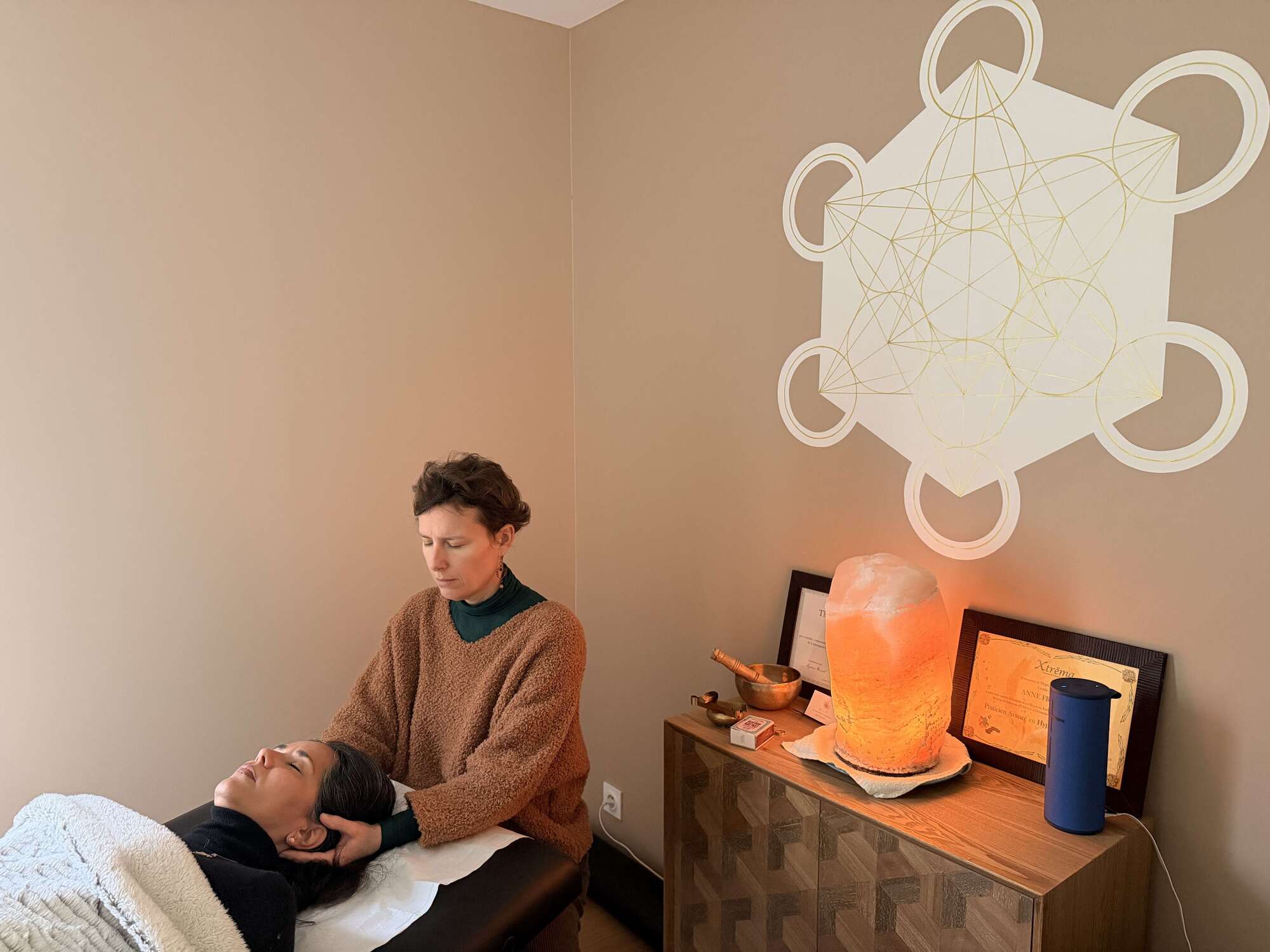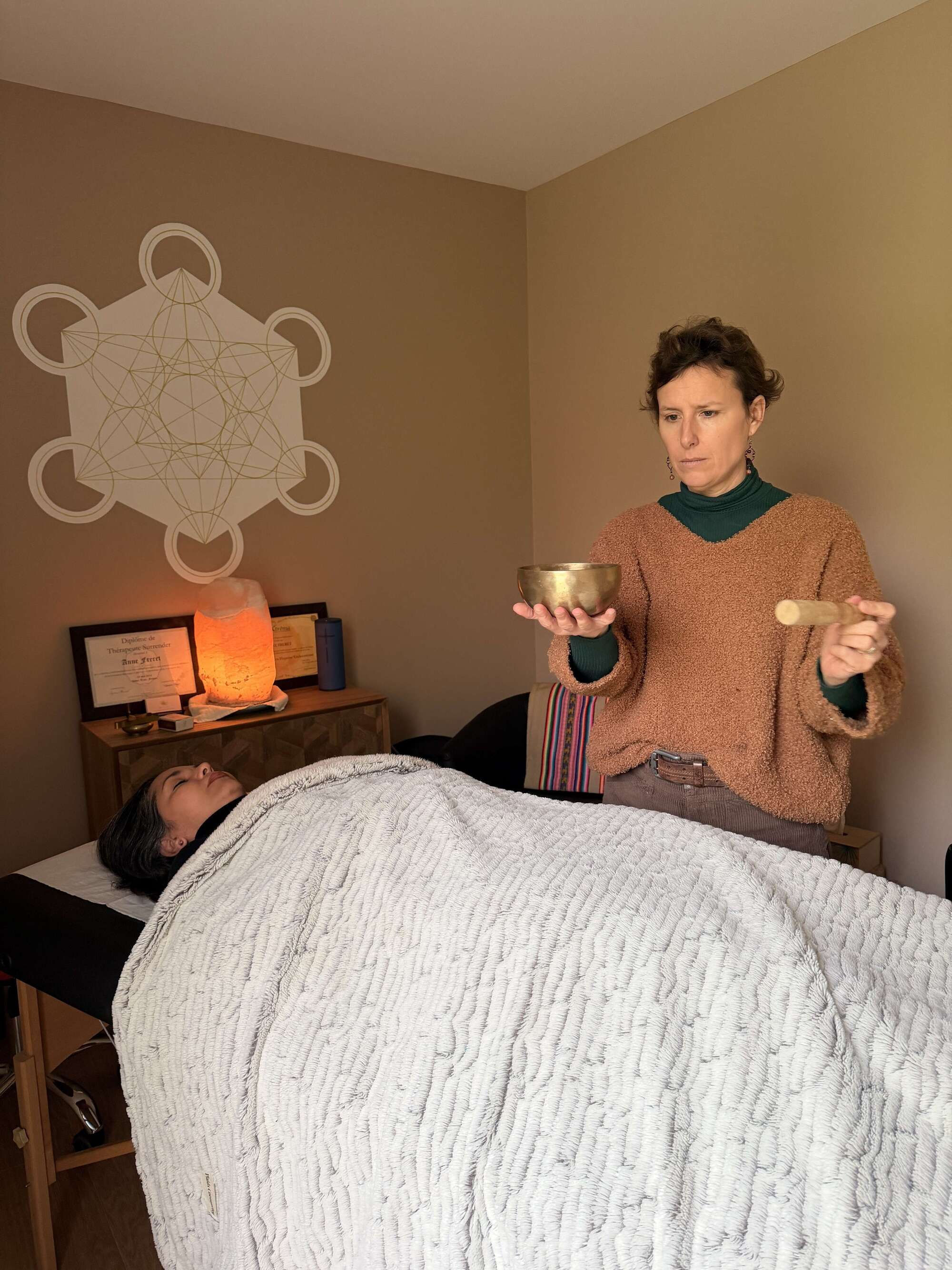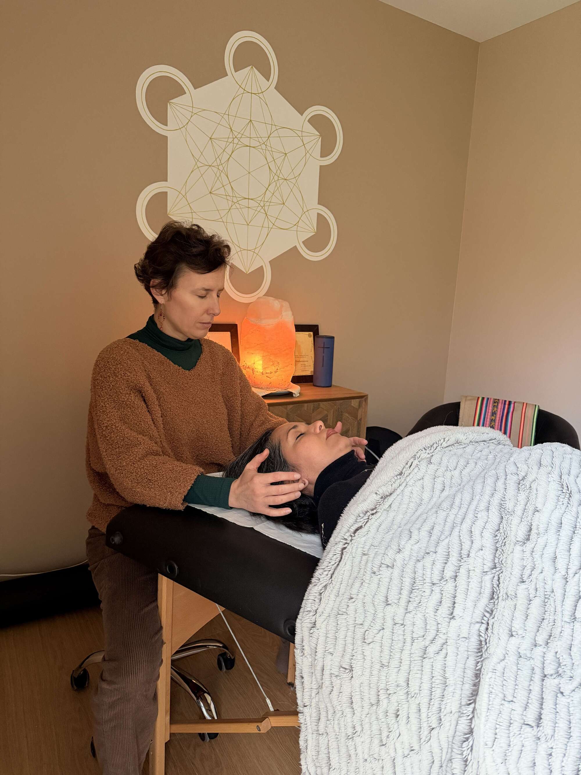 Une séance de soin Surrender se pratique sur une table de massage ou bien assis pour les personnes à mobilité réduite.