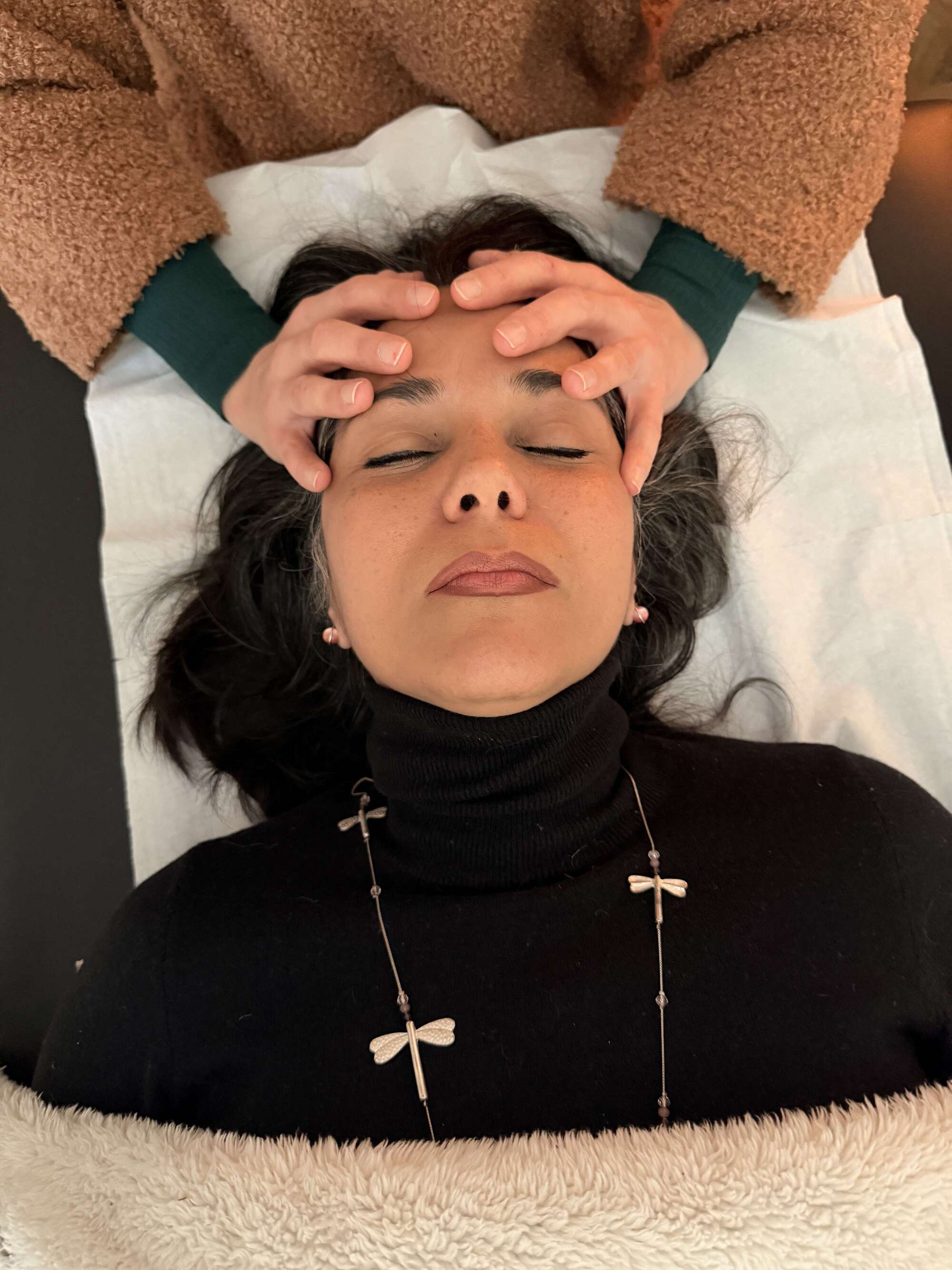 Une prise délicate est effectuée au niveau de la tête avec différents positionnements des mains sur votre crâne, ainsi que sur le visage (os de la face), les cervicales, et les épaules. Une seconde prise est effectuée au niveau du sacrum, cet os sacré que vous avez en bas de votre colonne vertébrale, juste au-dessus du coccyx.